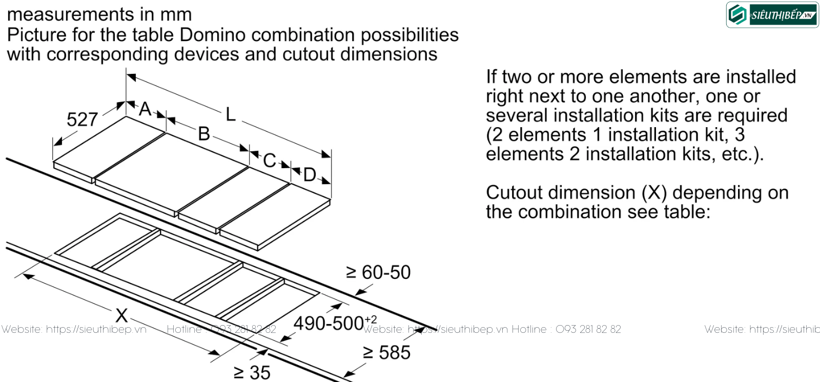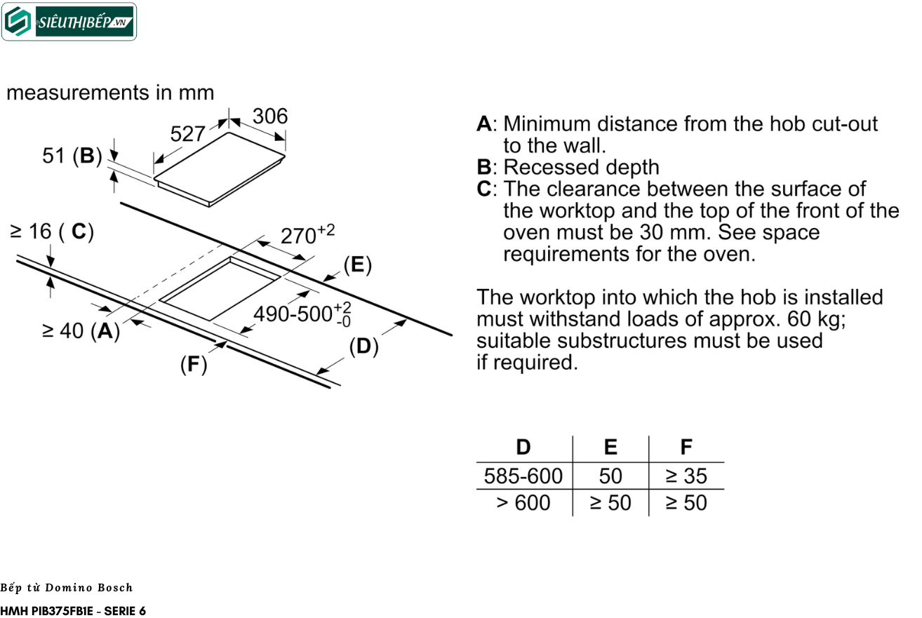 - Kích thước hộc bếp: 270-272R x 490-500S x 59C mm
