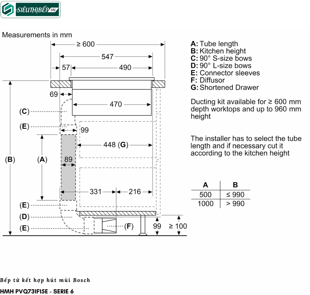 ‣ Kích thước hộc bếp: 560R x 490S x 223C mm