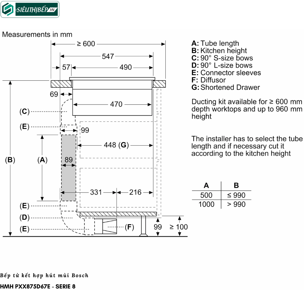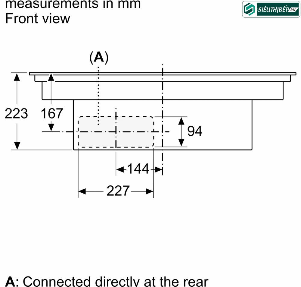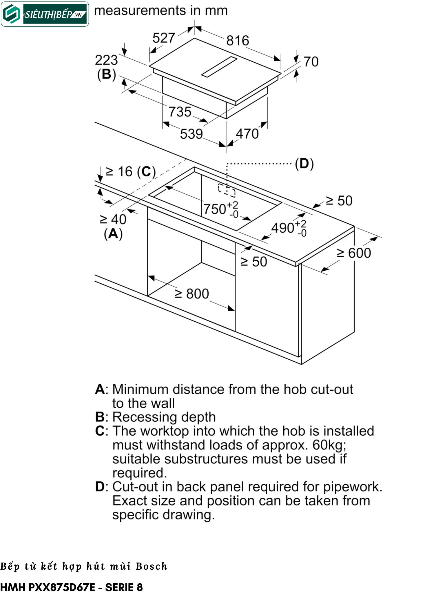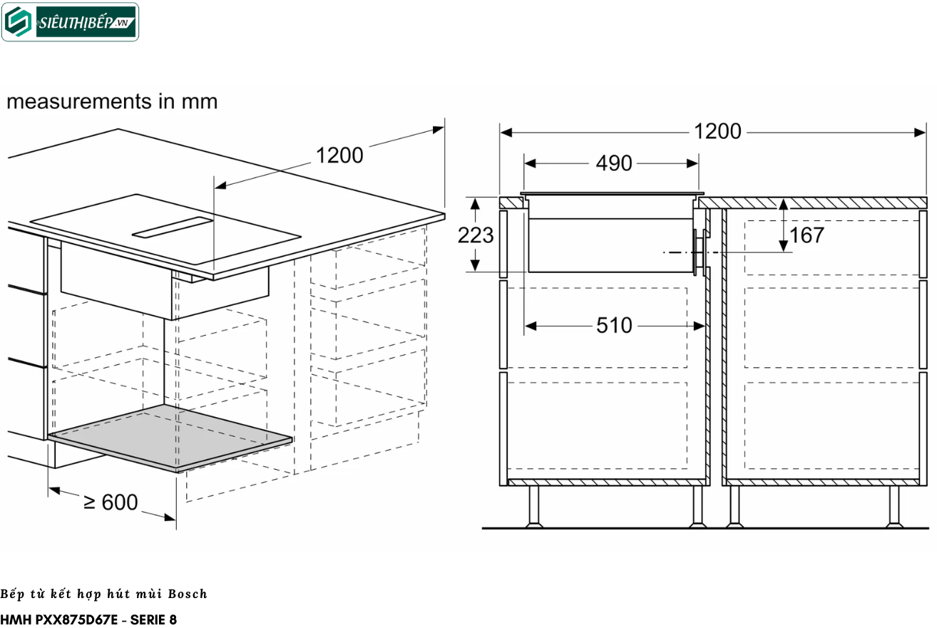 ‣ Kích thước hộc bếp: 750R x 490S x 223C mm