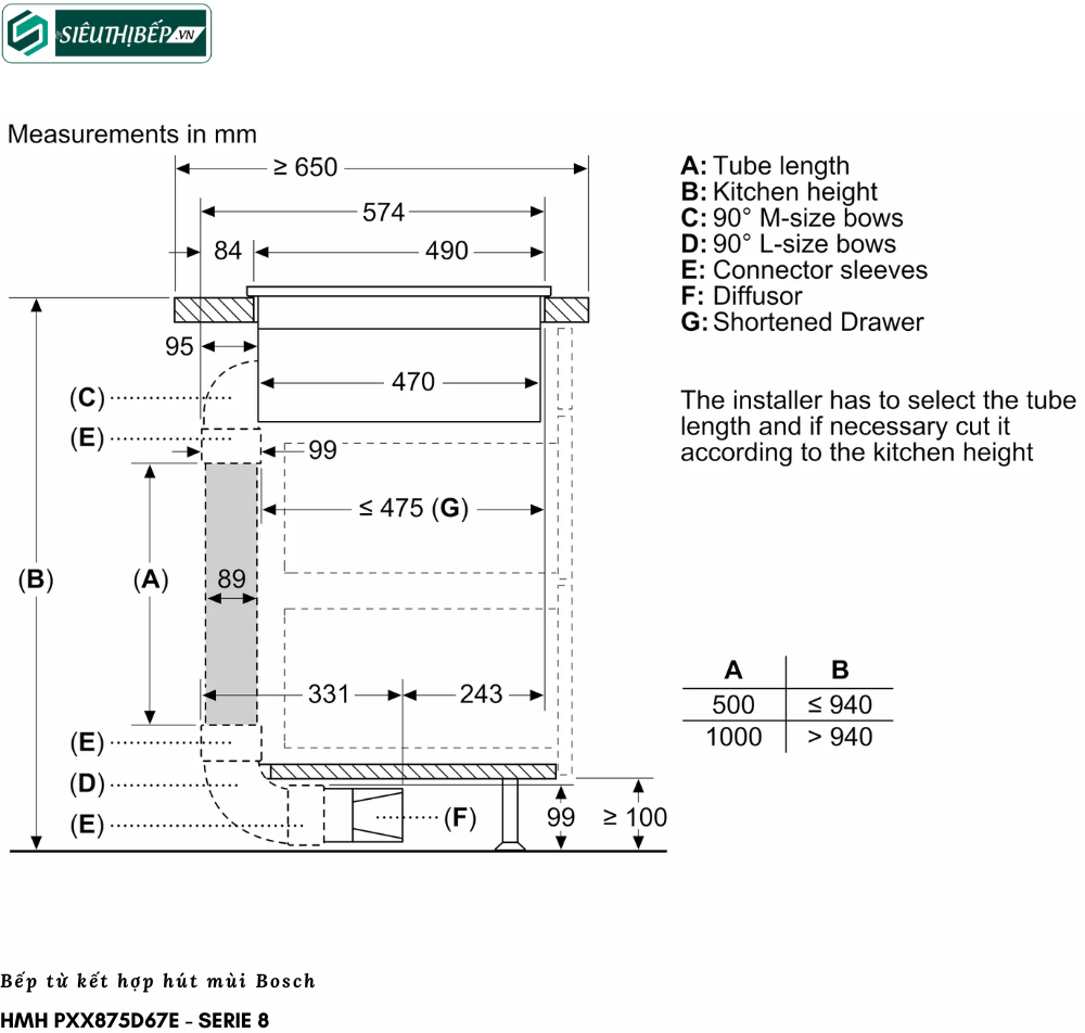 ‣ Công suất máy hút mùi tích hợp: 622 m3/h
