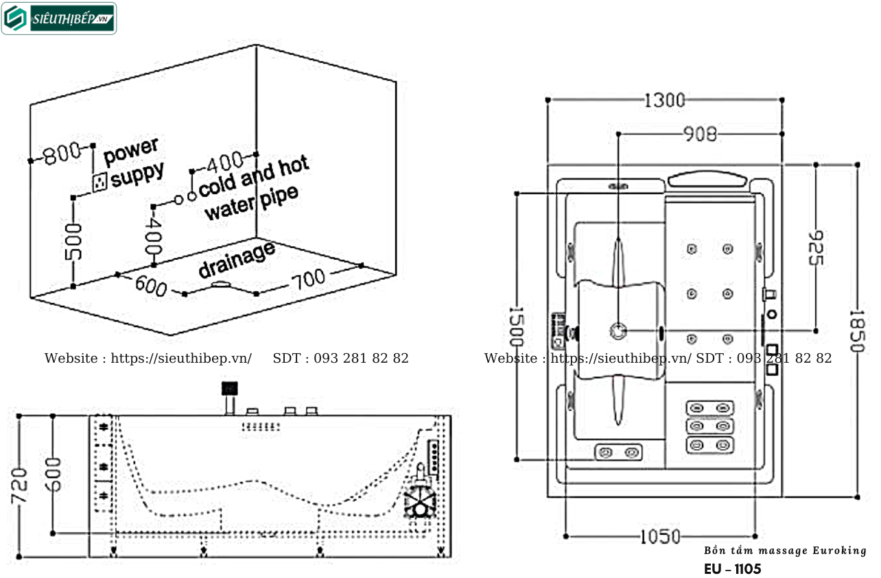 Bồn tắm massage Euroking EU-1105 – 2 khoang massage trong 1 bồn tắm