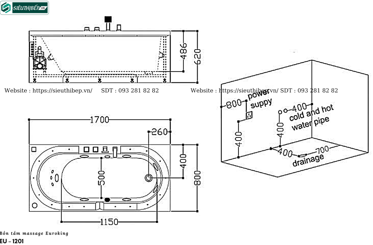 Bồn tắm EU-1201 có kích thước khá khiêm tốn. 1700 x 800 x 620 mm là độ lớn 3 chiều của chiếc bồn tắm này. EU-1201 chỉ có 1 gối cao su. Độ rộng của lòng bồn tắm là 500 mm, vừa đủ cho 1 người nằm.