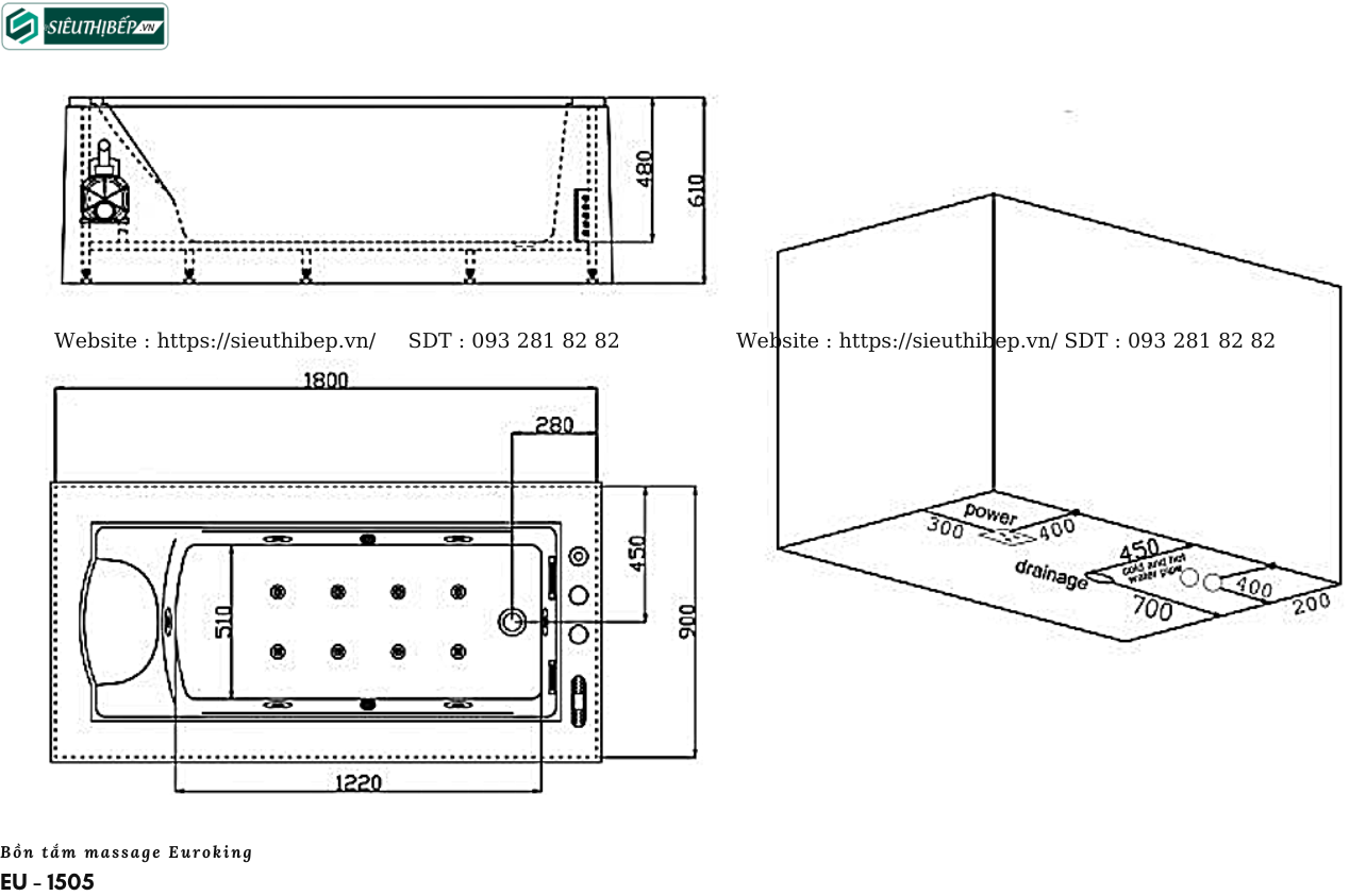 Kích thước 3 chiều dài x rộng x cao của EU-1505 lần lượt là 1800 x 900 x 610 mm. Cho dù phòng tắm của gia đình chúng ta rộng hay hẹp, EU-1505 sẽ chiều lòng được tất cả. Chỉ nhờ vào vẻ ngoài thanh lịch và một kích thước vừa phải của bồn tắm EU-1505.