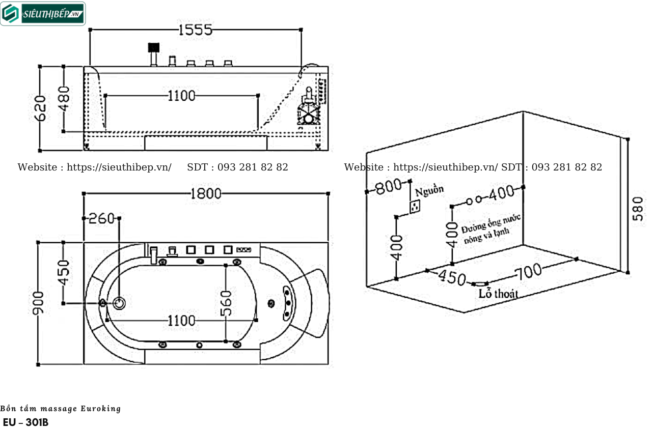 Kích thước 3 chiều dài x rộng x cao tổng thể của Bồn tắm Massage EU-301B lần lượt là 1800 x 900 x 620 mm. Bồn tắm massage cao cấp EU-301B phù hợp với những phòng tắm tương đối rộng rãi. Chúng ta dành 1,6m2 cho diện tích của bồn tắm và một phần bệ xung quanh. Nếu phòng tắm của gia đình chúng ta lớn hơn 10m2 thì có thể cân nhắc đến lựa chọn này.