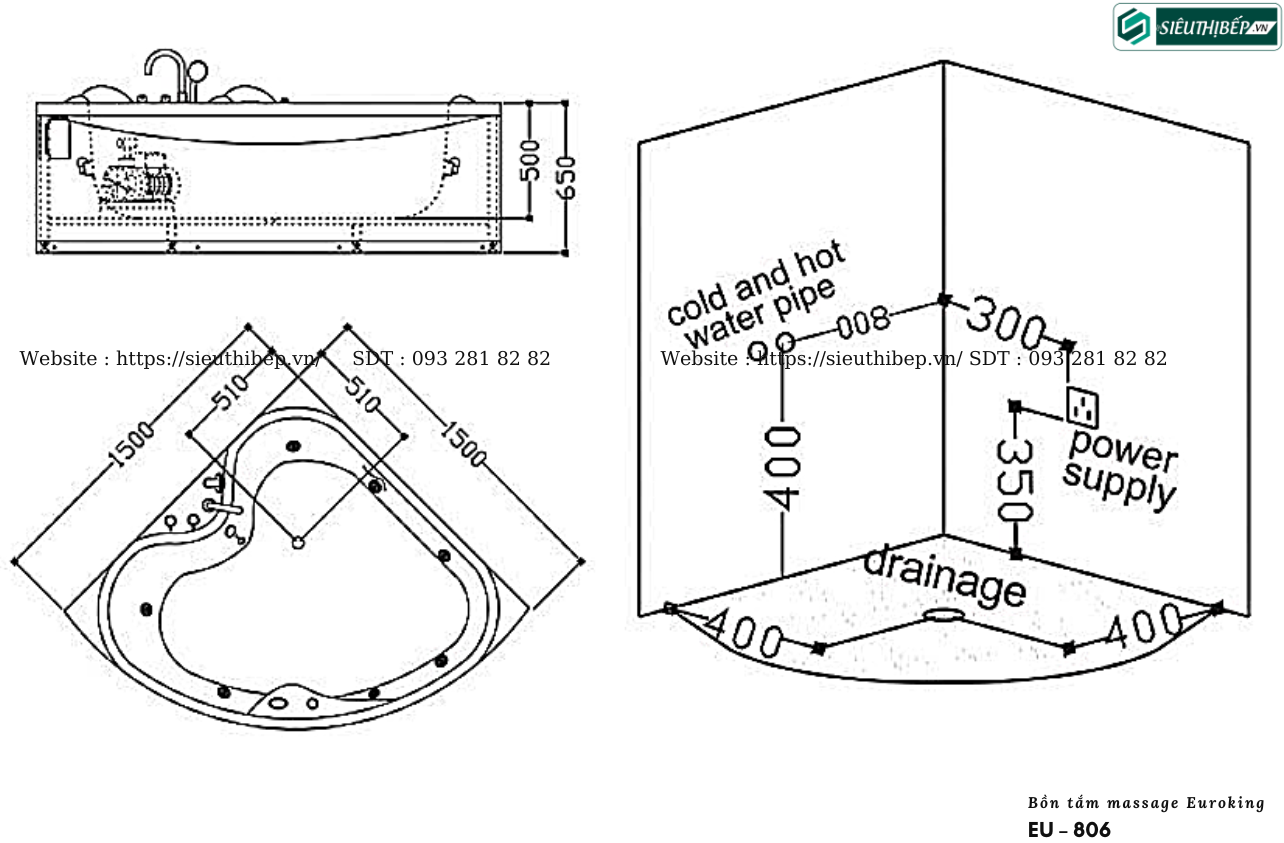 Thoạt nhìn thì có vẻ bồn tắm massage EU – 806 chỉ giống như những chiếc bồn tắm dạng góc thông thường. Thế nhưng, chỉ cần nhìn một chút nữa thôi bạn sẽ tìm thấy những nét khác biệt tuyệt vời. Những đường cong uốn lượn trên viền bồn được thiết kế nổi hẳn lên. Một bên viền còn uốn theo đường sóng nước, uyển chuyển không thể rời mắt.
