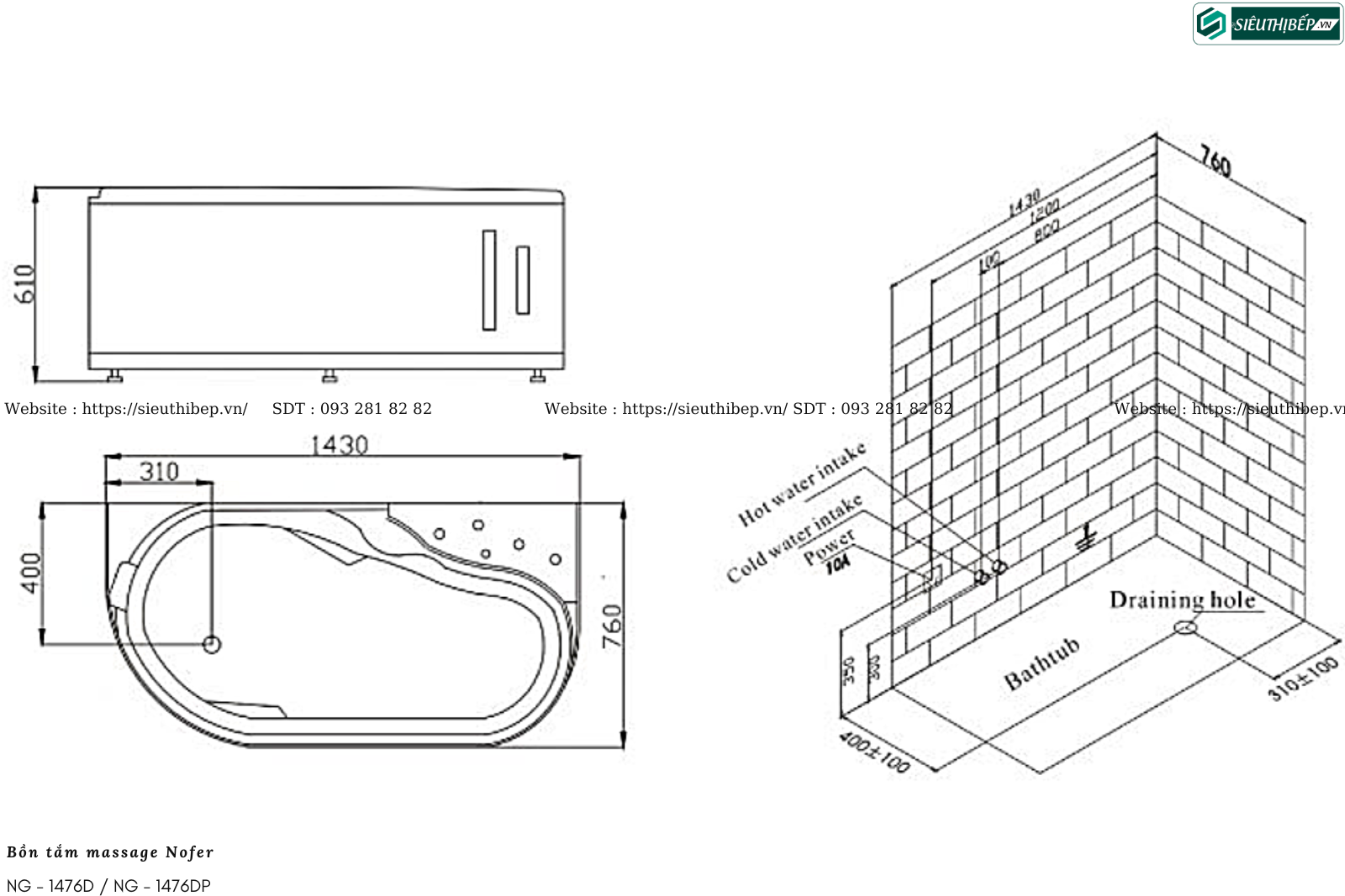 Các chức năng massage của bồn tắm NG-1476D/ 1476DP chỉ hoạt động khi được cung cấp đủ mực nước theo quy định.