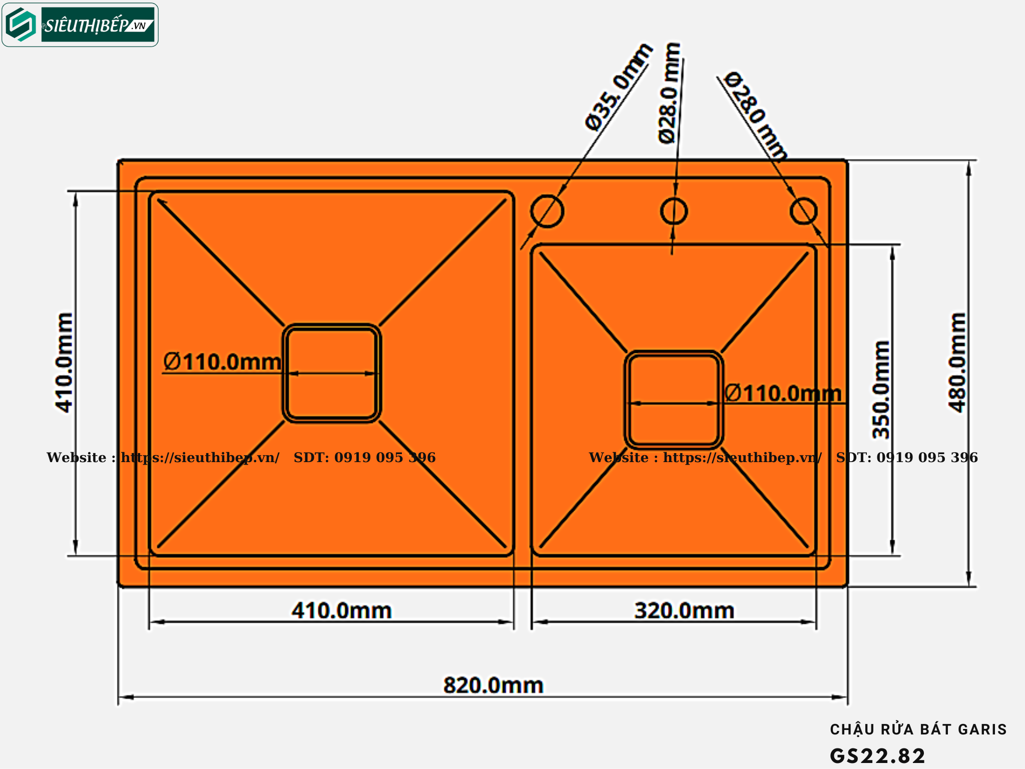 | Mã sản phẩm | Quy cách (Dài x Rộng x Sâu) mm | Kích thước từng hố (mm) | Loại chậu | Kích thước cắt đá (mm) | Đơn vị |