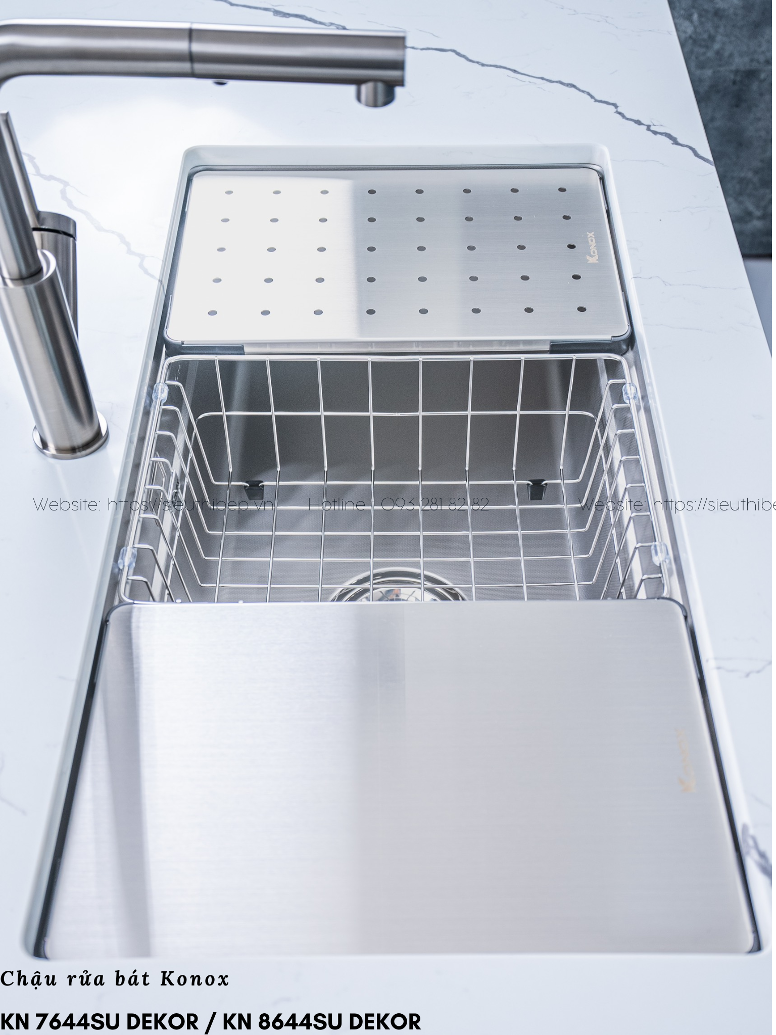 Dòng chậu rửa bát với thiết kế tích hợp phụ kiện thông minh như thớt trượt, Rollmat, Bottom Grid, Colander… nhằm đem lại cho người dùng những trải nghiệm làm bếp tiện ích nhất. Bắt nguồn từ sự thấu hiểu với nỗi vất vả của người nội trợ, KONOX phát triển dòng sản phẩm bồn rửa bát “ Workstation Sink” với bộ phụ kiện được tặng kèm mỗi Model chậu rửa, biến những khoảnh khắc làm bếp trở nên thú vị, dễ dàng hơn.
