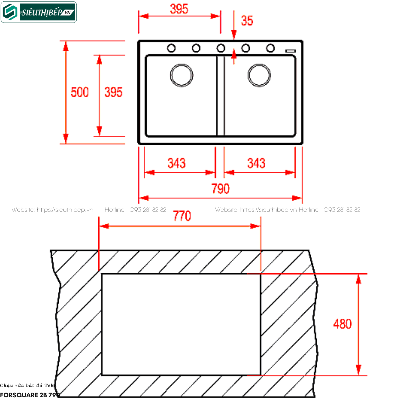 - Kích thước hộc rửa: 343 x 395 x 200mm