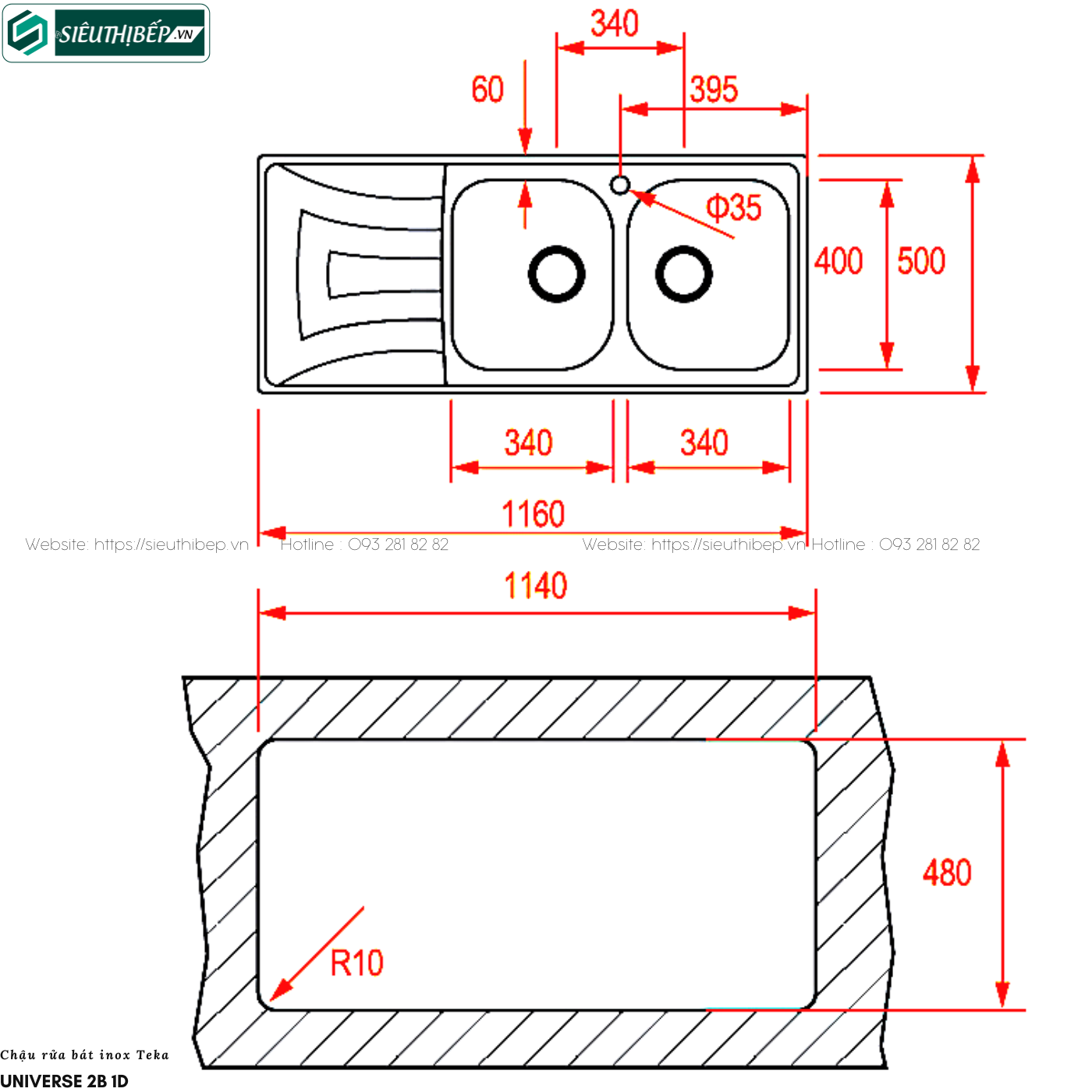 - Kích thước 2 hộc rửa (mm, RxCxS): 340x400x170