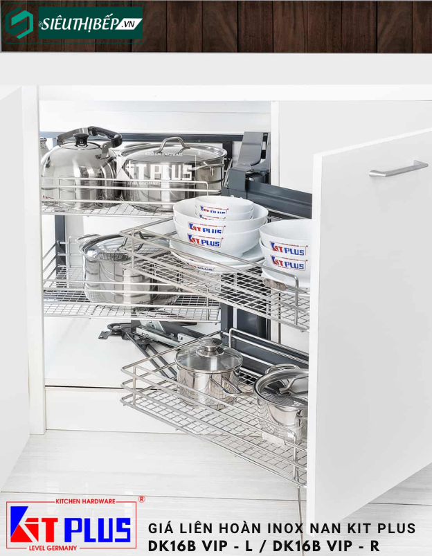 Giá liên hoàn inox nan DK16B VIP-L/ R là giải pháp cao cấp cho không gian của góc bếp , có thể tận dụng tối đa góc chết giúp bạn tăng diện tích sử dụng cho khu bếp, với thiết kế linh hoạt 4 rỏ có thể duy chuyển từ trong ra ngoài mà nó xứng đáng với cái tên “giá liên hoàn”, KIT PLUS sử dụng hệ khung lớn với chất liệu sơn tĩnh điện cao cấp và điểm đặc biệt là hệ ray giảm chấn kết hợp trên khung đã được thử nghiệm đóng mở trên 5000 lần.
