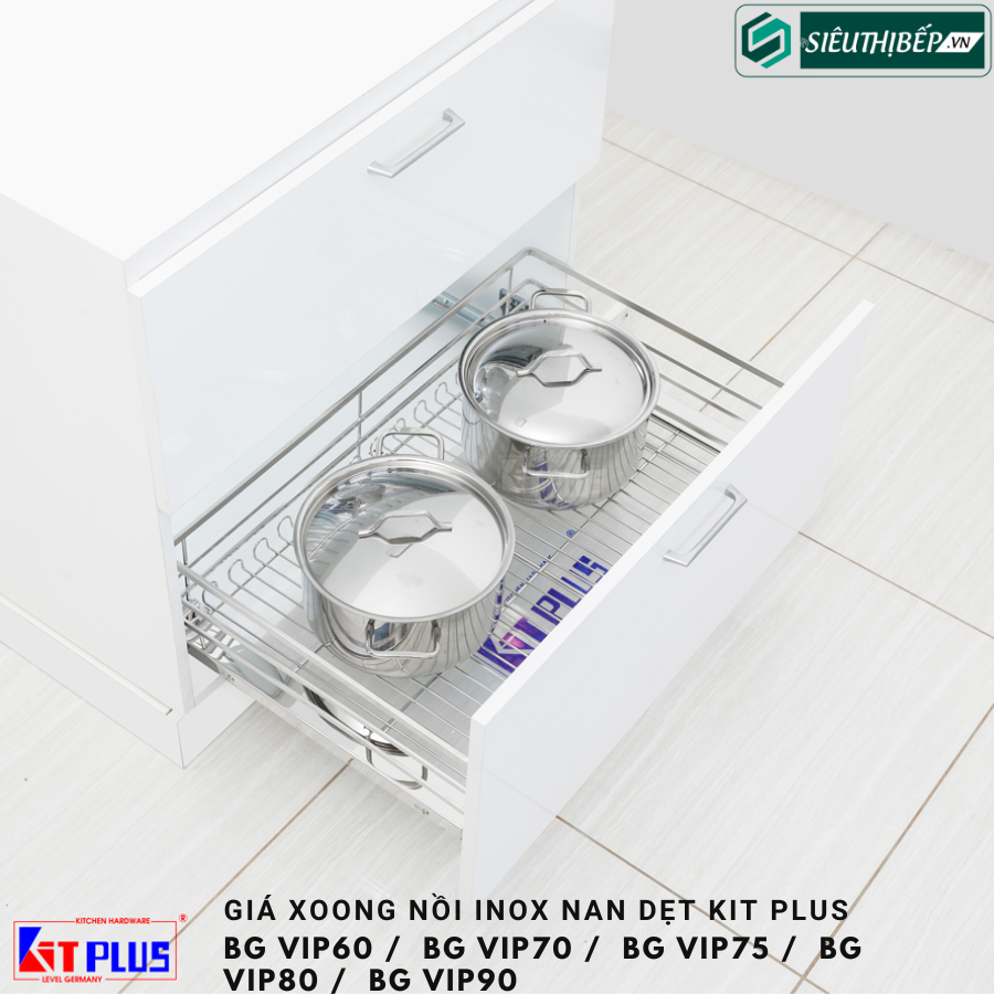 Để đáp ứng nhu cầu cao cấp hơn của quý khách hàng. KIT PLUS đã phát triển thêm mẫu giá xoong nồi nan dẹt với những đường nét sang trọng hơn, sử dụng những linh kiện cao cấp hơn nữa. BG VIP60 / BG VIP70 / BG VIP75 / BG VIP80 / BG VIP90với cấu tạo sợi dẹt luôn chắc chắn nâng cao sức chứa cũng như độ bền của sản phẩm mang lại nhiều tiện ích cho không gian bếp.