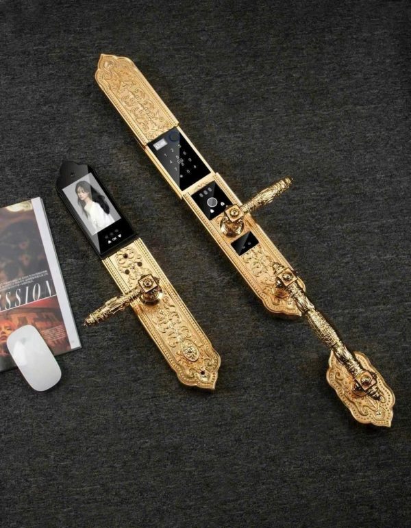 Thiết kế sang trọng: Khóa được chế tác từ đồng nguyên khối, mạ vàng 24K, với hoa văn tinh xảo, mang đến vẻ đẹp đẳng cấp cho không gian sống.