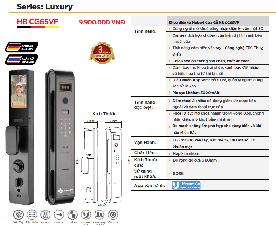 🛠️ Thông số kỹ thuật khóa điện tử Hubert cửa gỗ HB CG65VF