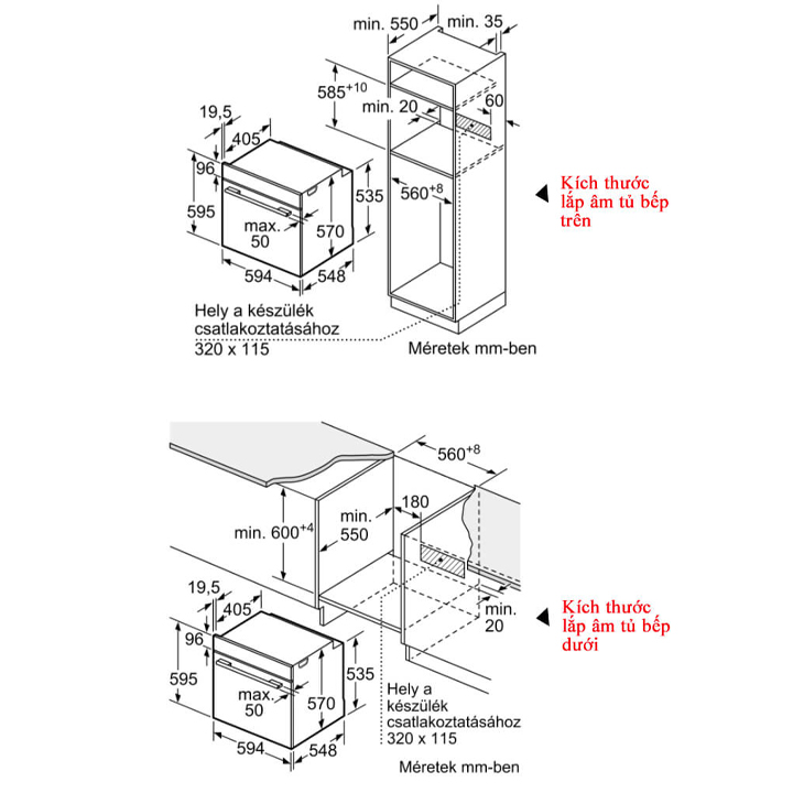 Kích thước ngách (HxWxH): 560 mm - 568 mm x 585 mm - 595 mm x 550 mm
