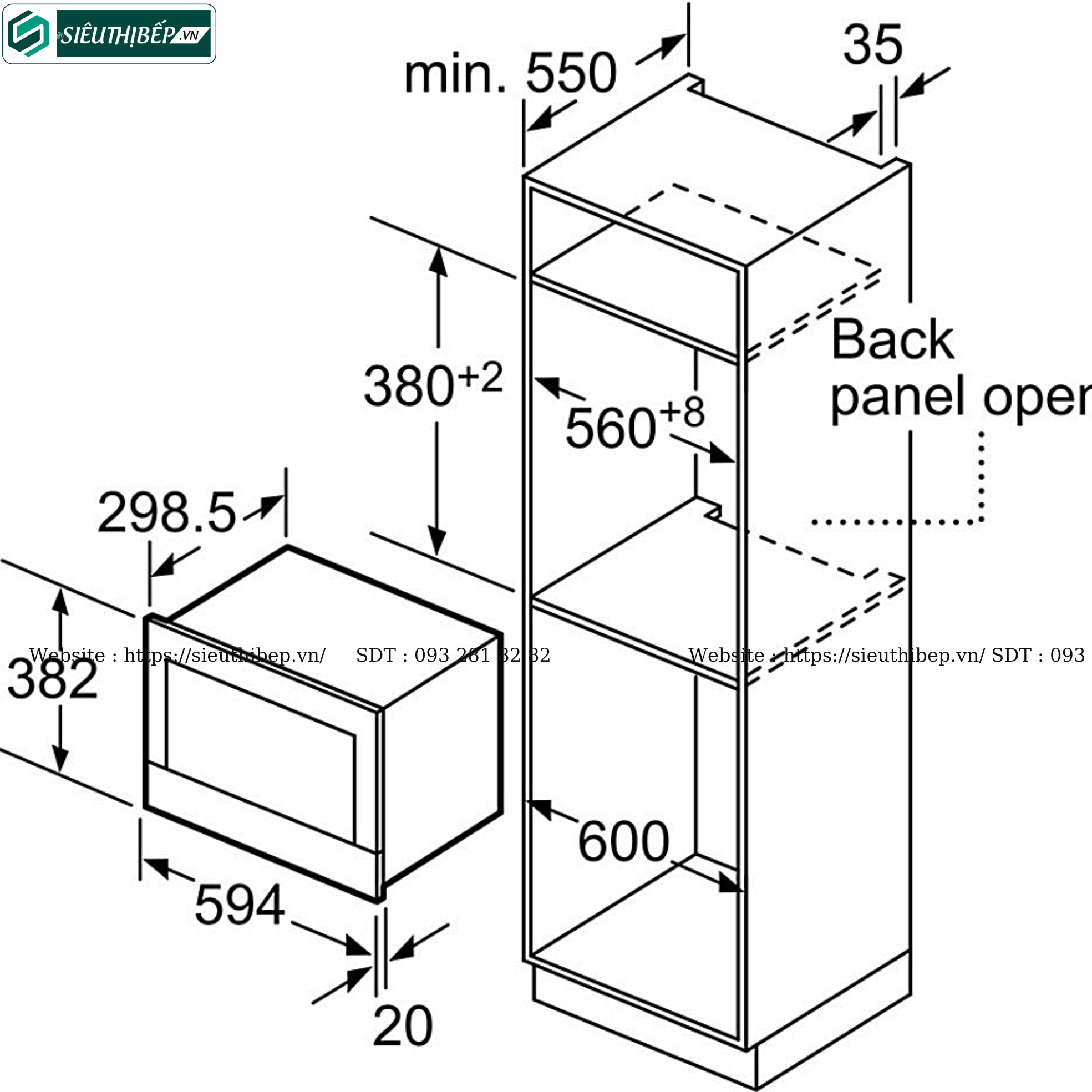 Kích thước lắp đặt (C x R x S) | 362 mm - 365 mm x 560 mm - 568 mm x 300 mm |