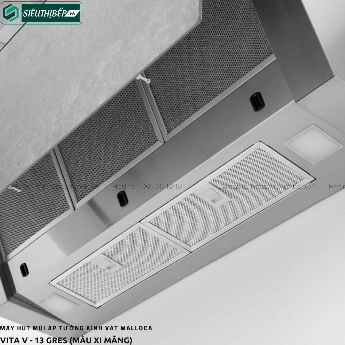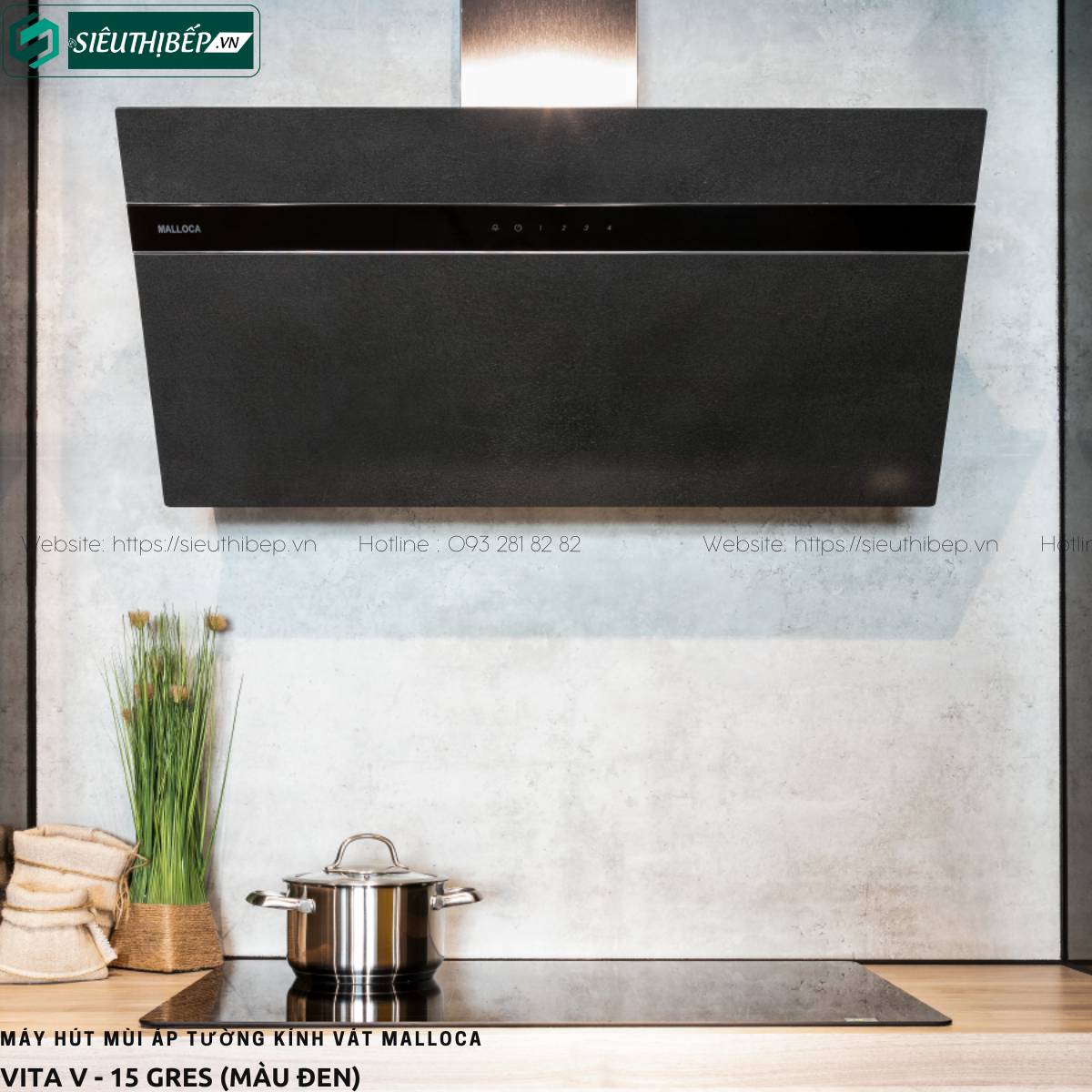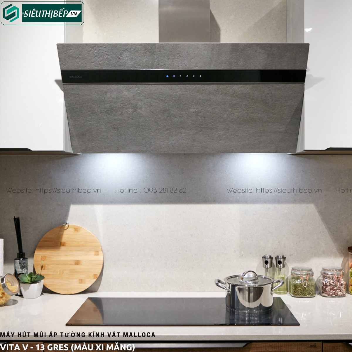 Máy hút mùi áp tường kính vát Malloca VITA V - 15 GRES (Màu đen) / VITA V - 13 GRES (Màu xi măng)