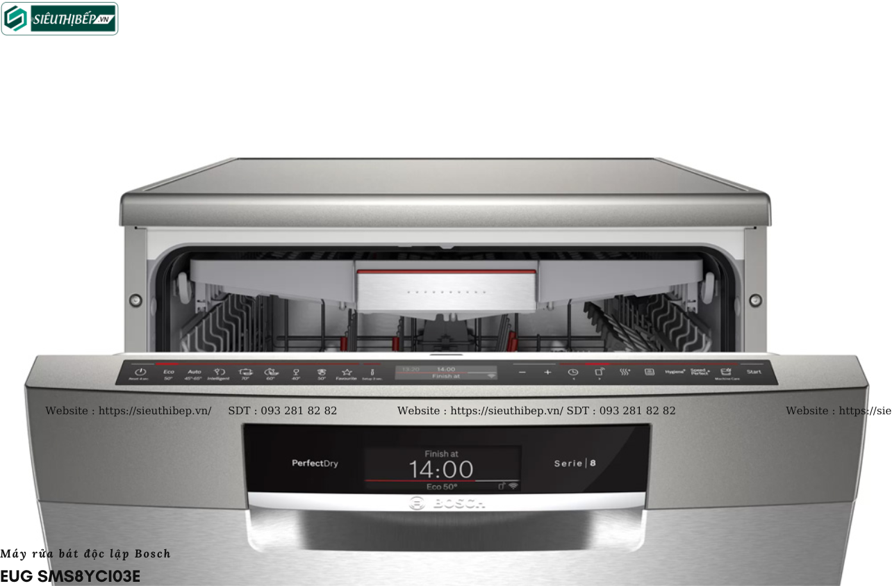 Máy rửa bát độc lập Bosch EUG.SMS8YCI03E - serie 8 là sản phẩm thuộc phân khúc cao cấp, được sản xuất trên dây truyền hiện đại bậc nhất tại nhà máy của Bosch tại Đức. Bề mặt máy là thép không gỉ chống vân tay toát lên vẻ cao cấp và sang trọng. Máy được trang bị công nghệ sấy Zeolith giúp làm khô hoàn triệt để ngay cả những đồ khó khô nhất, kết nối thông minh HomeConnect, chương trình rửa thông minh tự động cải thiện hiệu suất rửa dựa trên đánh giá thông qua HomeConnect, hệ thống giỏ Max Flex Pro và Rackmatic mang đến sự linh hoạt tối đa trong việc cho đồ rửa vào và lấy ra.