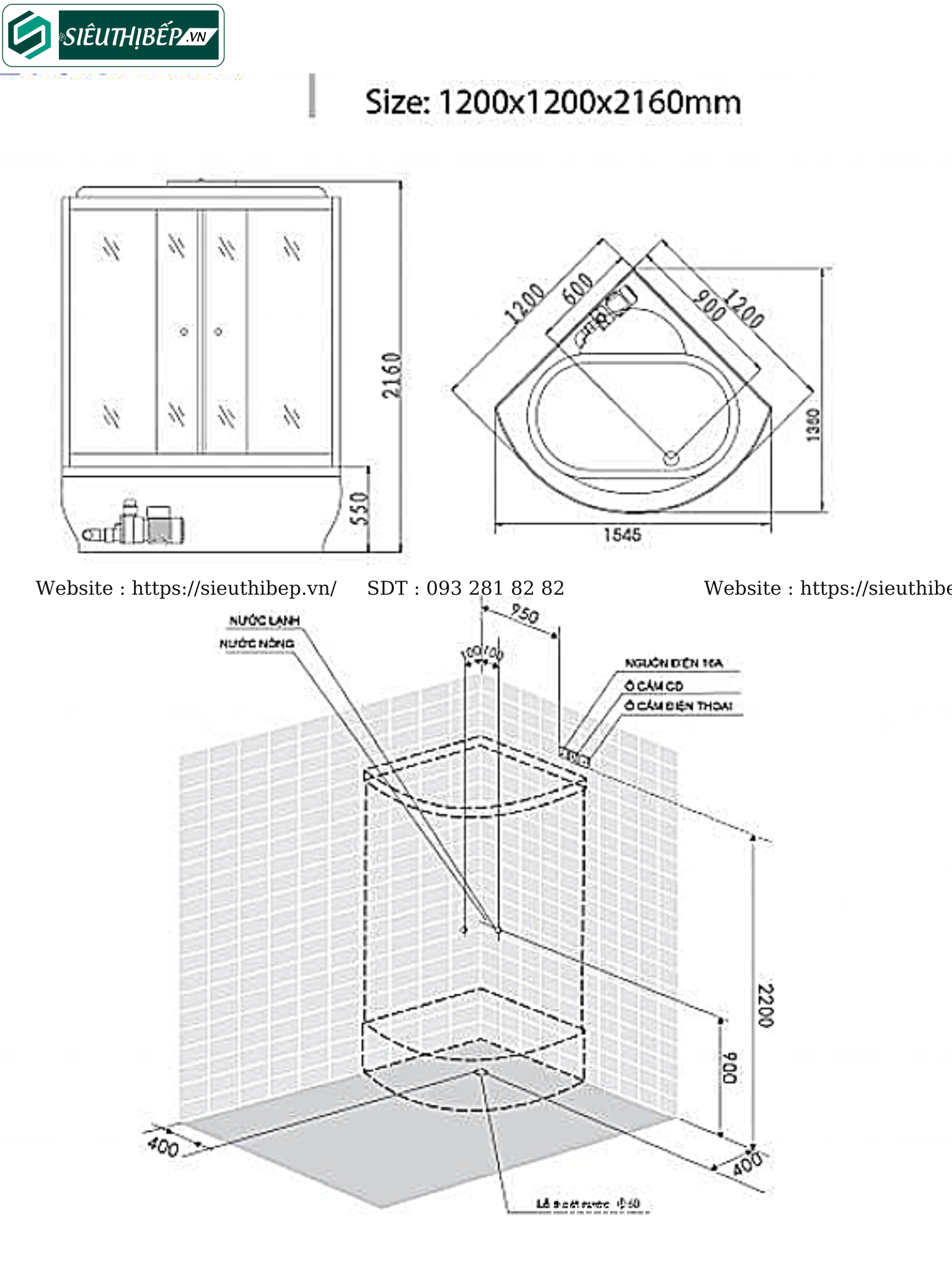 Với kích thước 1200*1200*2160 mm không gian tương đối rộng rãi và thoải mái cho 2 người.