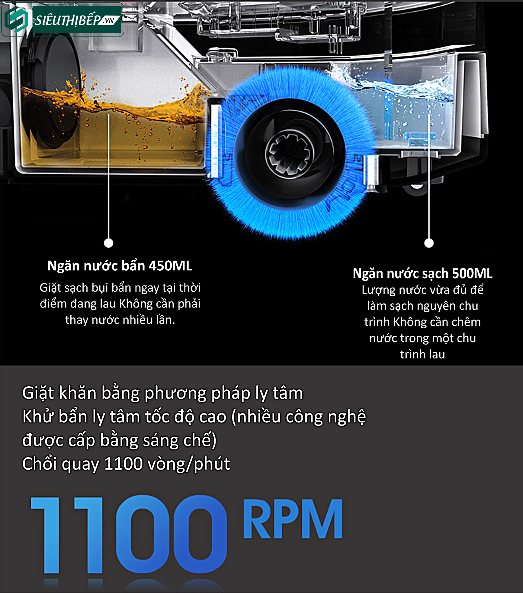 - Ngăn nước bẩn 450ml giặt sạch bụi bẩn ngay tại thời điểm đang lau, không cần phải thay nước nhiều lần
