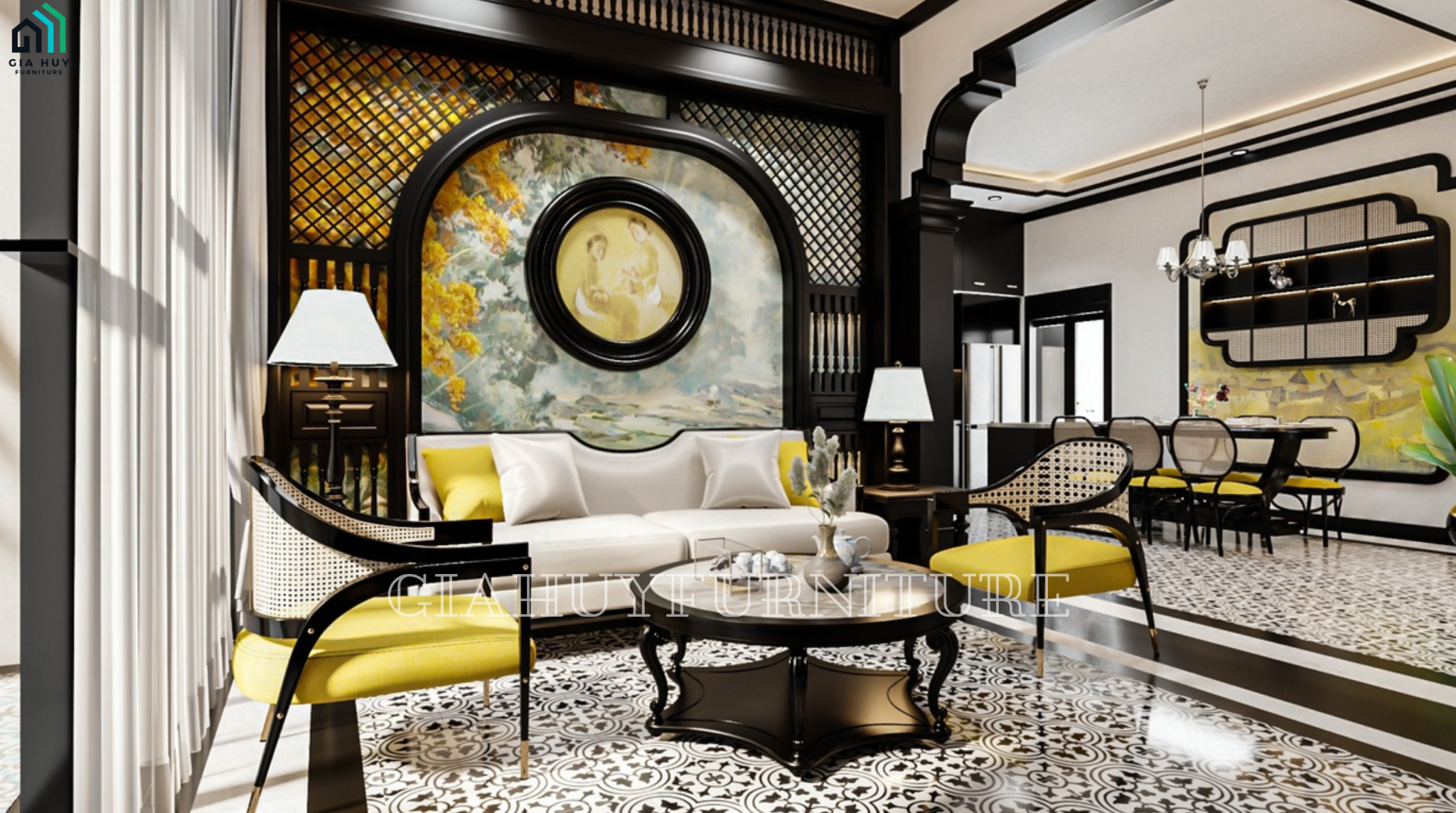 Chọn lựa gam màu trắng chủ đạo trong thiết kế nội thất đã tạo nên một phong nền hoàn mỹ giúp các đường nét trên trần, tường, vòm cửa trở nên nổi bật hơn. Bên cạnh đó, các KTS còn bổ sung thêm tone vàng ấm đặc trưng của phong cách trên đồ nội thất. Mặt khác, bức tranh sơn thủy trang trí phía sau khu vực sofa kết hợp tranh sơn dầu nhấn điểm đã tạo nên một nét đẹp khó rời mắt khi đến với không gian phòng khách.