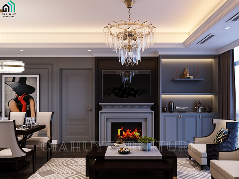 Đối với phong cách bán cổ điển, cách sắp xếp, đặt để cũng như chọn lựa từng vật dụng nội thất phù hợp có ý nghĩa rất quan trọng quyết định tính "hoài cổ" của không gian. Ở đây,chúng tôi đã dùng nội thất làm từ chất liệu gỗ và nhựa giả gỗ sơn trắng để khớp với định hướng phong cách thiết kế của căn nhà. Ngoài ra, sắp xếp nội thất phòng khách theo thứ tự bếp - bàn ăn - bàn sofa sẽ mang đến tiện ích tối ưu nhất cho người sử dụng.