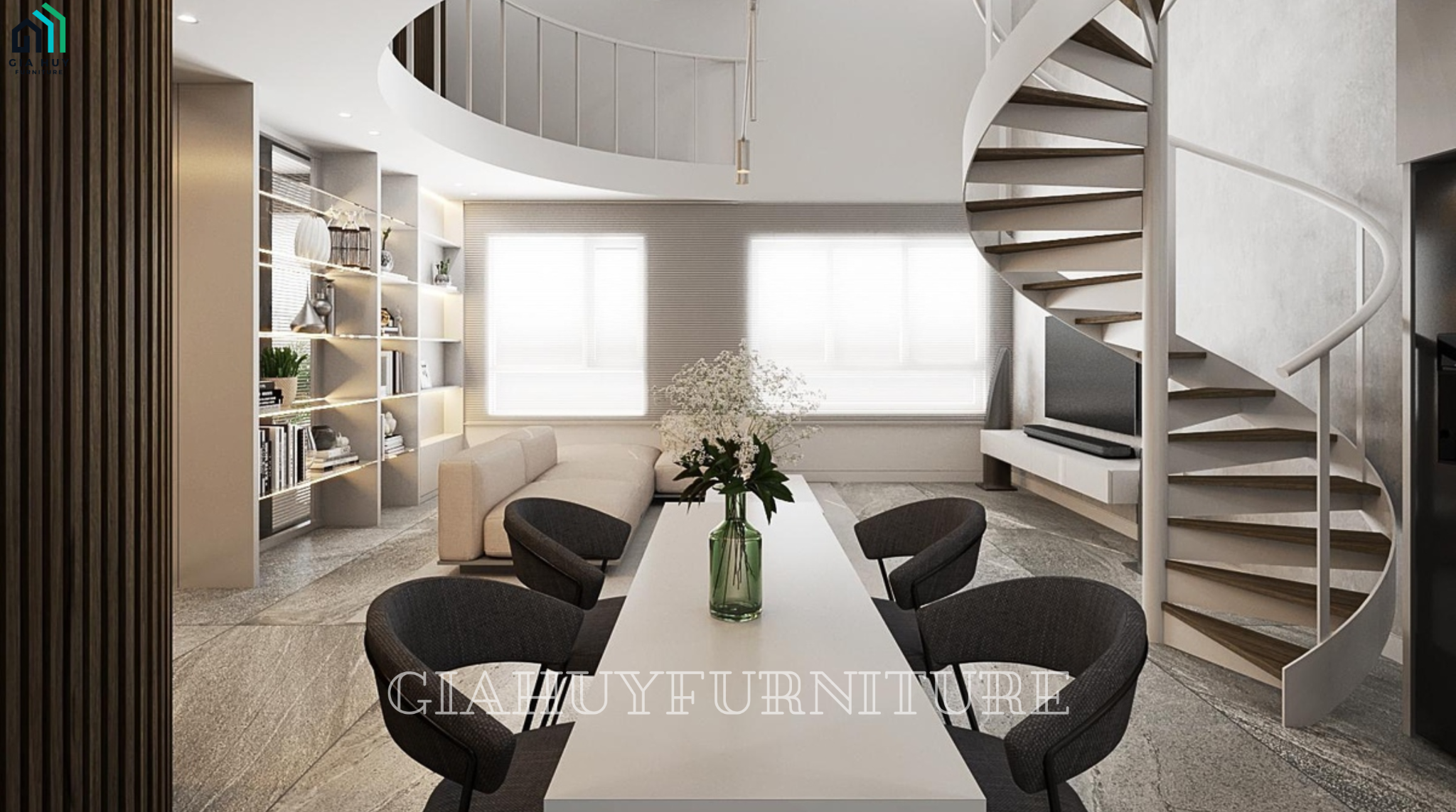 Căn hộ được thiết kế độc đáo gồm 2 tầng với phong cách nội thất hiện đại, tối giản được bố trí khoa học. Gam màu trang nhã, sang trọng kết hợp với ánh sáng tự nhiên mang đến một không gian sống thoải mái và tươi sáng cho gia chủ.