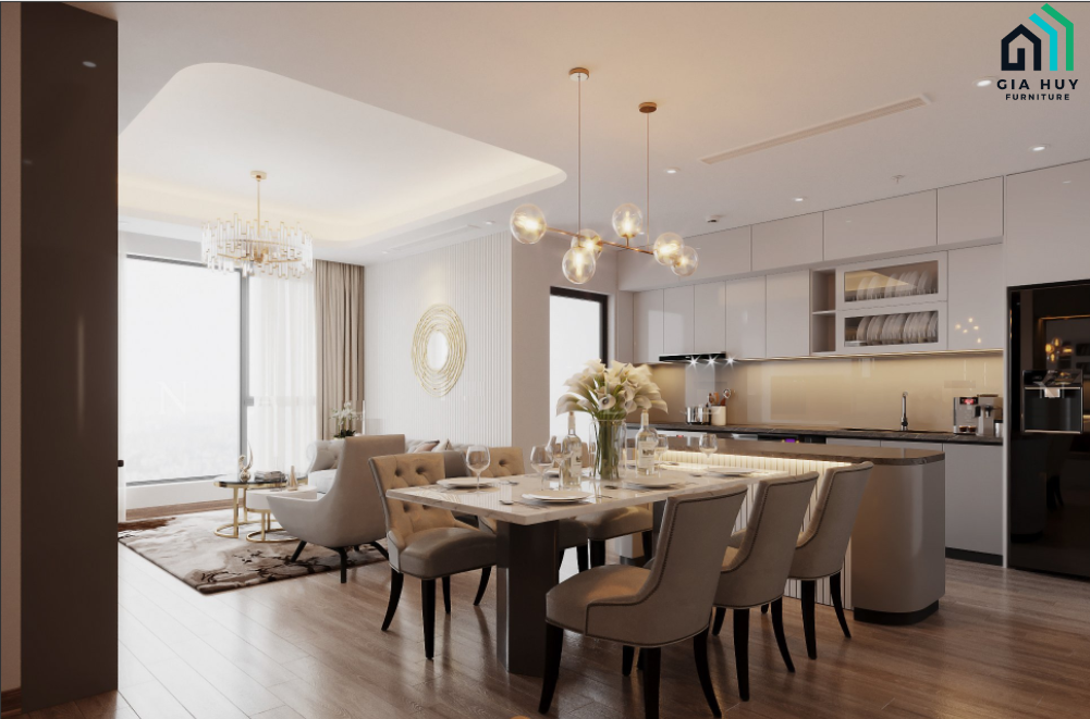 Khu vực bàn ăn, bếp và phòng khách liên thông với không gian là kiểu kiến trúc quen thuộc của những chung cư cao cấp hiện nay. Ghế an và sofa cùng 1 chất liệu là cách tạo nên tính đồng bộ vô cùng tốt. Bàn ăn rộng rãi với mặt đá cao cấp phù hợp với nhu cầu sử dụng hiện nay.