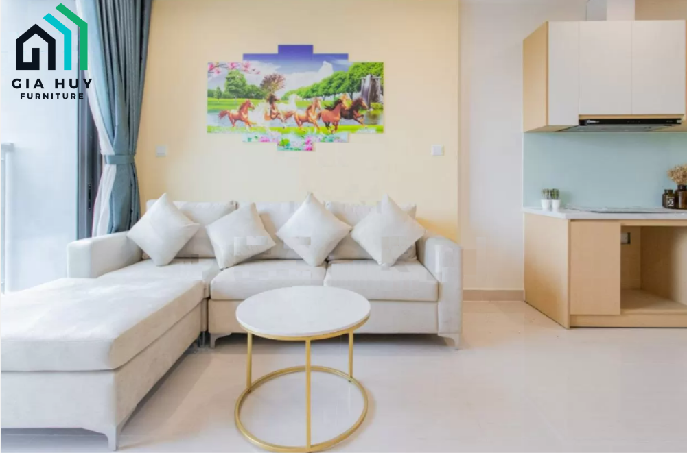 Bộ Sofa chữ L màu sáng nổi bật phòng khách chung cư