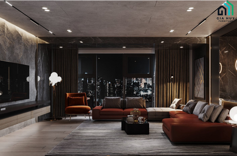 Về màu sắc: sử dụng tông màu trầm ấm pha chút màu nóng để tạo điểm nhấn. Cách các KTS phối màu trong không gian để tạo nên tính cộng hưởng chỉ thường thấy trong những công trình mang tầm thế giới chính là tạo nên sự tương hỗ giữ: màu sofa, màu bàn trà, màu sơn tường, màu sàn gỗ kết hợp với ánh sáng đèn led vừa đủ. Cách điều phối tiết chế này tạo nên sự hài hòa trong màu sắc cũng như thẩm mỹ toàn bộ không gian.