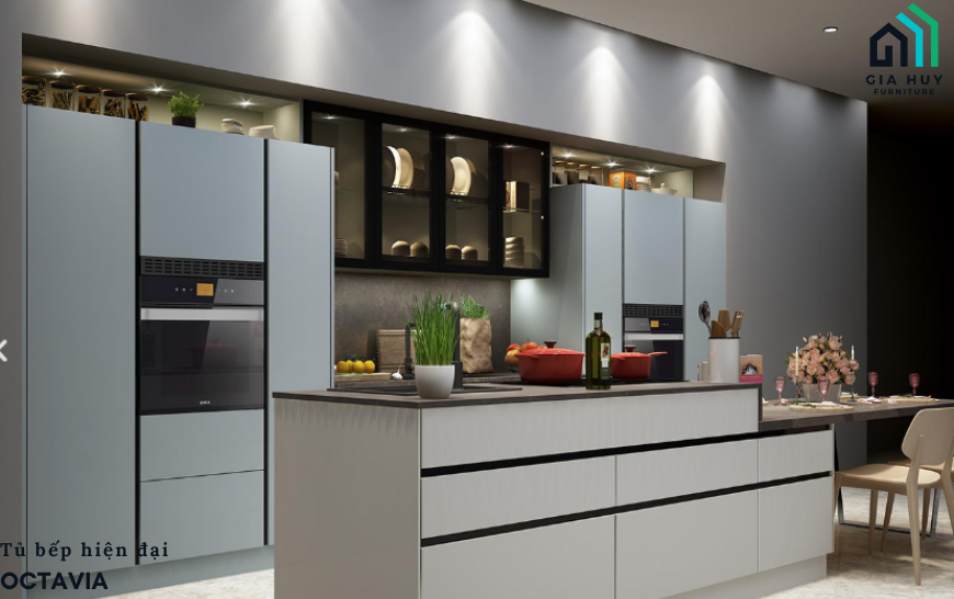 – Việc kết hợp đảo bếp và bàn ăn rất thuận tiện cho những buổi ăn nhanh, bàn ăn đi liền với đảo bếp Octavia hiện là mẫu tủ bếp luôn chiếm được sự ưu tiên lựa chọn để tiết kiệm không gian sống hiện nay. Với giải pháp tiết kiệm không gian cùng tone màu xanh, Octavia tạo nên nét tinh tế, hài hòa và cân xứng của bố cục bếp.