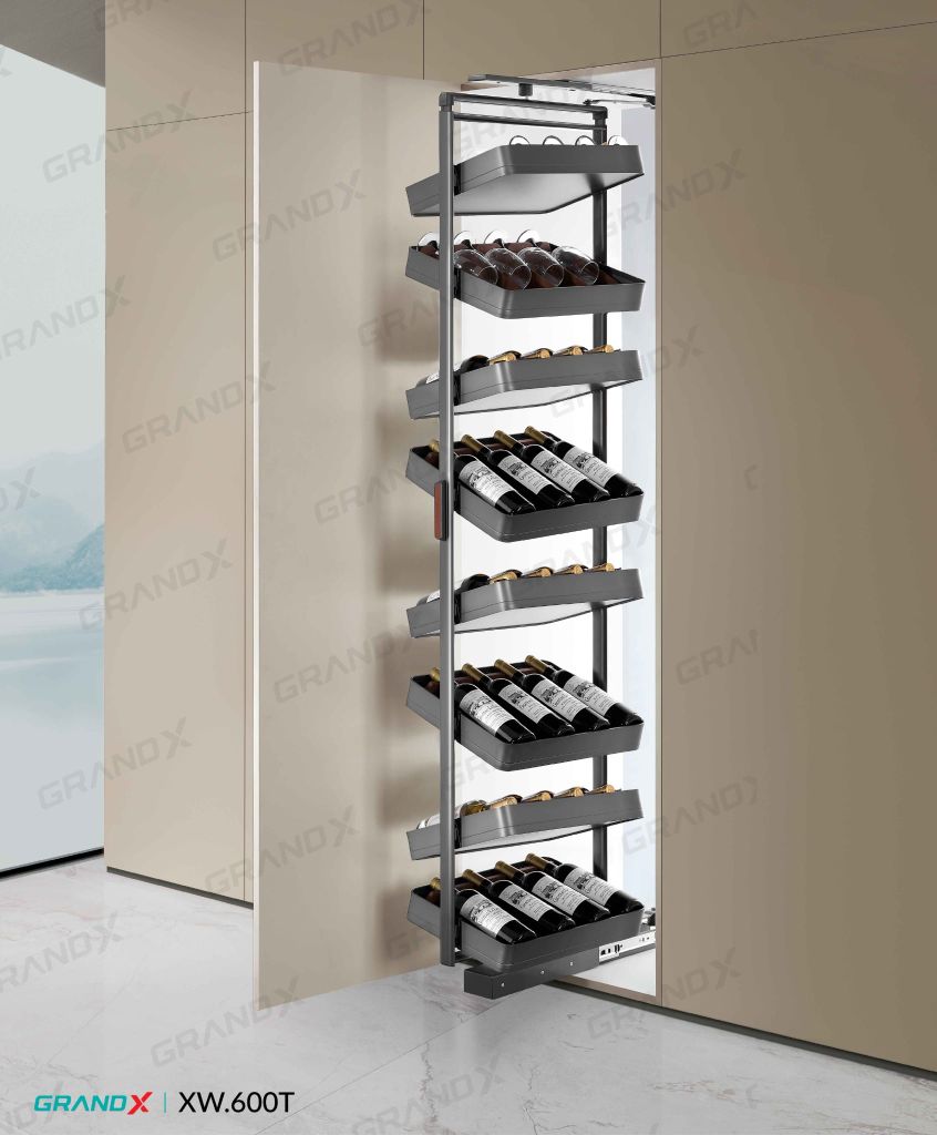 - Tủ đồ rượu vang xoay 8 tầng GRAND X được thiết kế các giỏ có vách ngăn gỗ hầm rượu chất lượng cao, dày có tác dụng chống va đập và hút ẩm tốt, giá để ly có gợn sóng 2 lớp để giữ